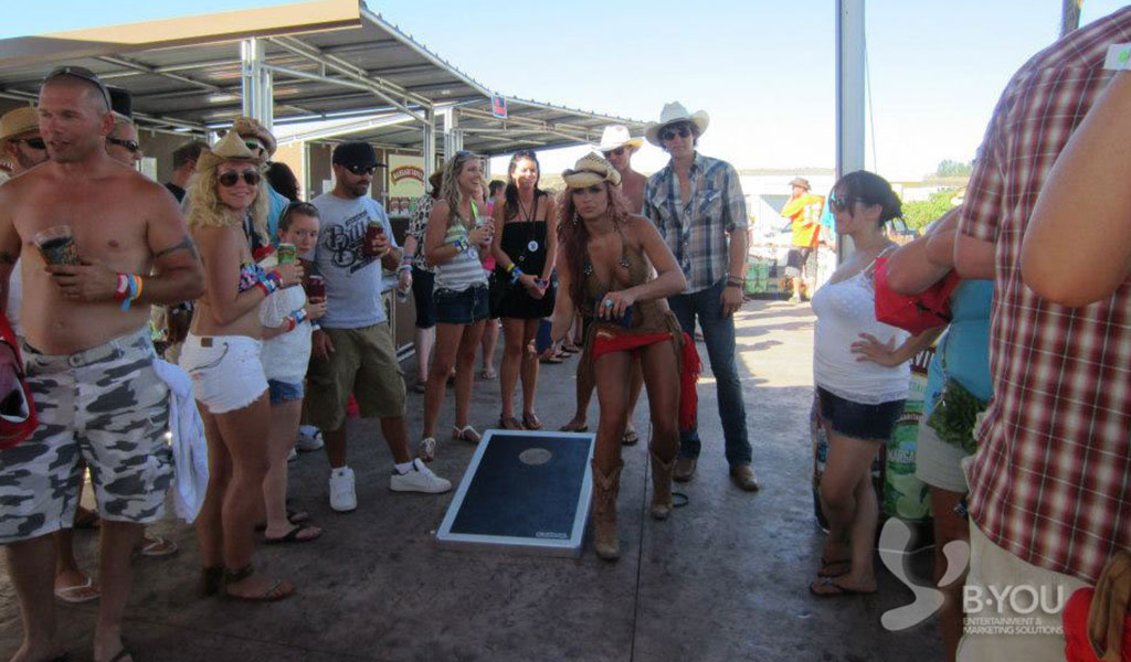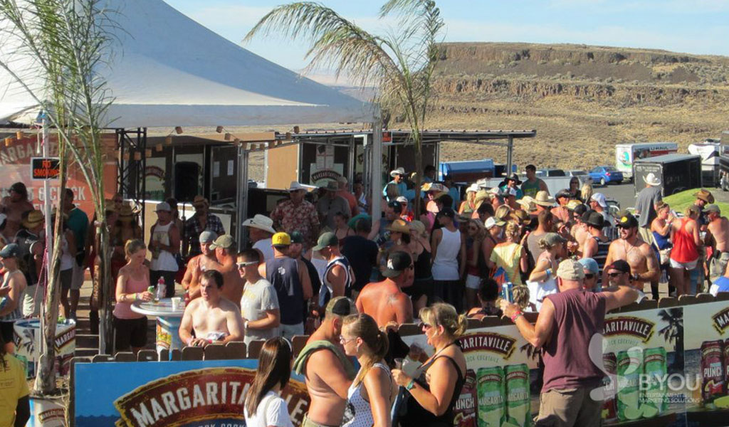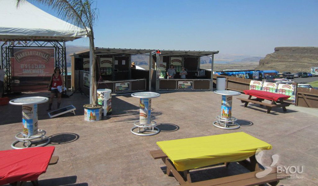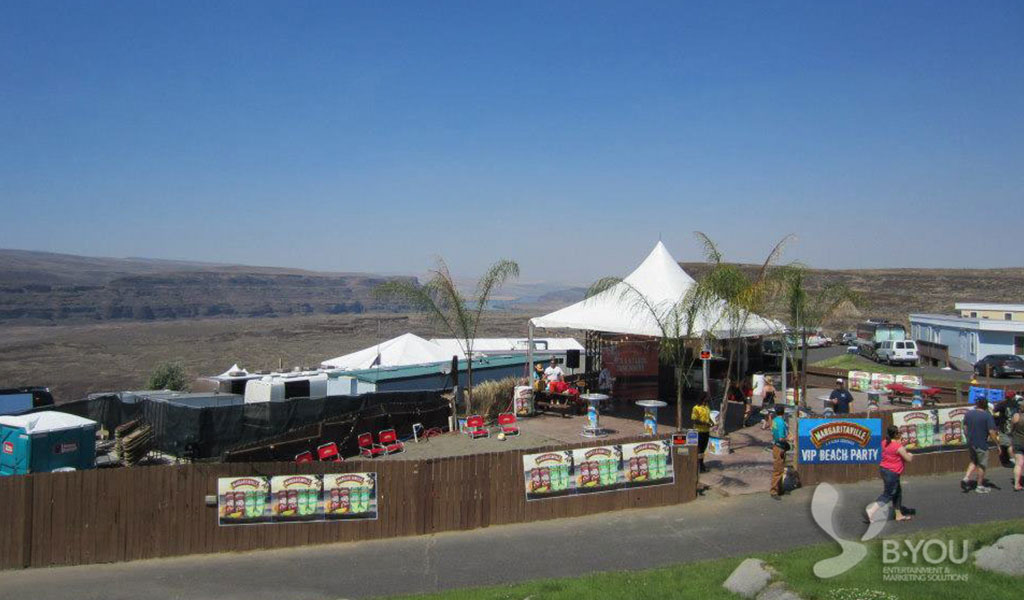 B-You Entertainment brought to life a unique beach Paradise in the middle of the Columbia River Canyon: The Margaritaville VIP Beach Party. The VIP area was located right next to the Stage and a door away from backstage.